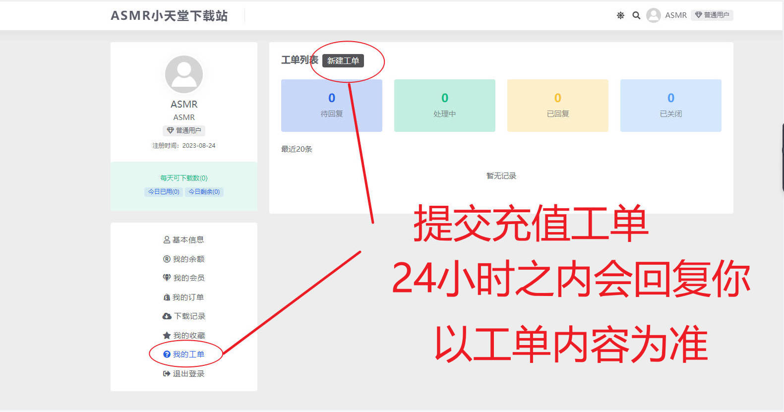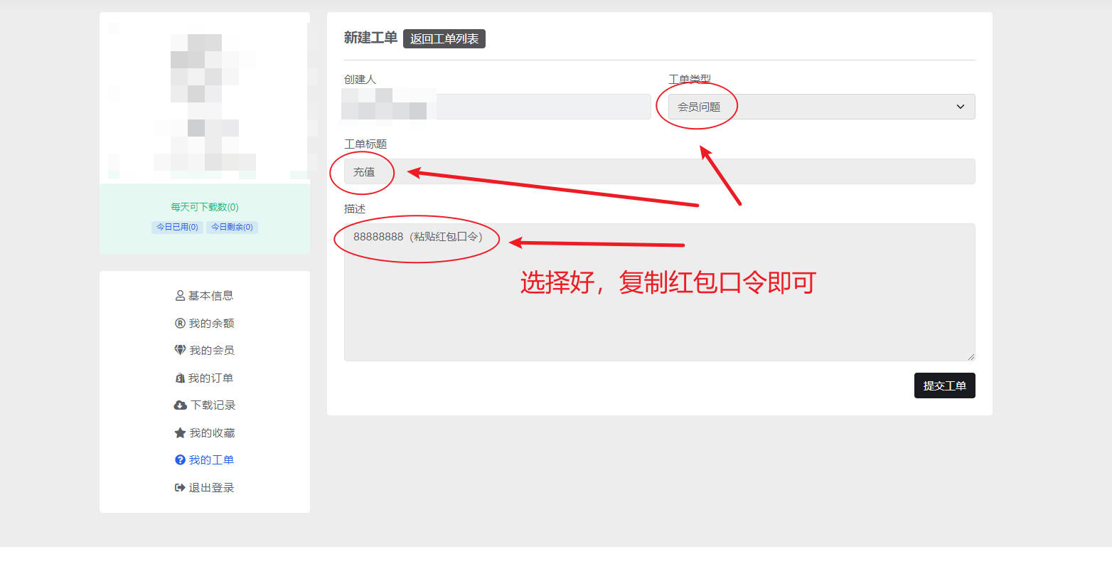 第二步:在个人中心里面找到我的工单,新建工单,粘贴红包口令,提交充值工单申请;耐心等待回复,24小时之内