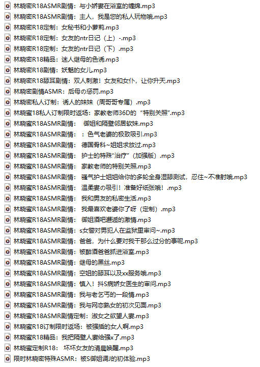 林晓蜜,ASMR音频博主,内容高能,与秋水、哈尼并称优质ASMR剧情三元老,普通的ASMR剧情也非常不错,此贴为高能ASMR福利合集,她的资源最贵,属于土豪专属,当时人气也是最高的;这里随便一个资源,是单个资源她都卖999或者666,还有520;百元以内只能买到普通ASMR剧情单集
